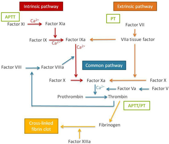 Blood coagulation times can be assessed by performing two tests that correspond to the two pathways of coagulation cascade activation (Figure 7). It is important to study both the extrinsic and the intrinsic coagulation times, since nanomaterials can produce a specific effect in only one of the pathways, which thus might be underestimated if only one is studied.