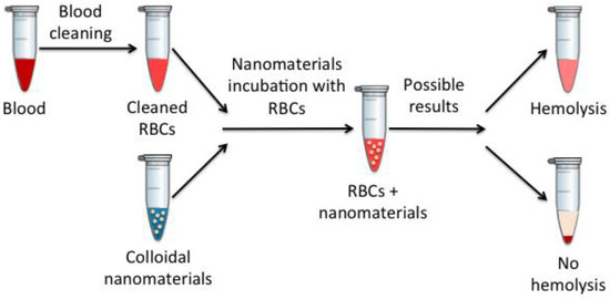 Hemolysis is one of the most commonly used techniques to study the effects that injected materials produce have on the blood, since, in this case, these in vitro results usually correlate quite well with in vivo results [40]. To measure the produced hemolysis, spectroscopic measures are performed in nanomaterials incubated with erythrocytes at different times, as schematically described in Figure 8.
