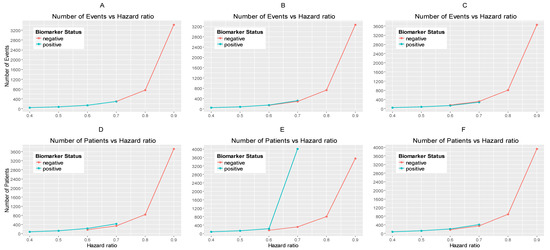 From Table S1, and more clearly from Figure 2A–F, it can be seen that for each scenario of hazard ratios, the required number of events and patients in the biomarker-negative subgroup is greater than in biomarker-positive subgroup.