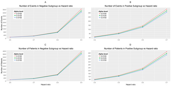 It can be seen that for all scenarios of hazard ratios, the highest value of the number of events and patients in the biomarker-negative subgroup and in the biomarker-positive subgroup is given by and for negative and positive patients respectively and the lowest value is given by and for negative and positive patients respectively.