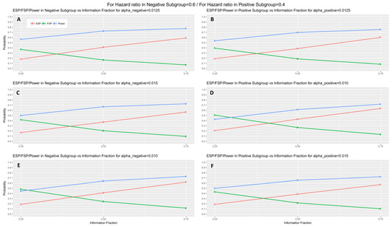 From Table 1 and Tables S2–S4, it can be seen that the futility stopping probability of each biomarker-defined subgroup at each significance level decreases when the percentage of information fraction increases. On the contrary, the efficacy stopping probability, the total power of the study, the sample size and the number of events increase with the increase of the information fraction.