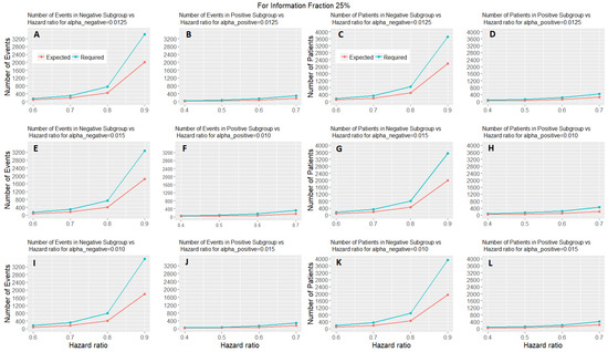 Figure 6 shows the expected number of events and patients of the adaptive parallel subgroup-specific design and the required number of events and patients of the fixed parallel subgroup-specific design for each biomarker-defined subgroup versus the corresponding hazard ratios for the first level of information fraction (i.e., 25%). Figures S4 and S5 provided in the Supplementary Materials (File S) show the expected number of events and patients of the adaptive parallel subgroup-specific design and the required number of events and patients of the fixed parallel subgroup-specific design for each biomarker-defined subgroup versus the corresponding hazard ratios for the second and third level of information fraction (i.e., 50%, 75%). Figure 6 and Figures S4 and S5 show that the expected number of events for both biomarker-defined subgroups in all cases of hazard ratios is lower than the required number of events. Additionally, in all cases of interim fraction and significance levels, both the required and the expected number of events are greater in biomarker-negative subgroup as compared to the biomarker-positive subgroup. Furthermore, they show that the expected number of patients for both biomarker-defined subgroups in all cases of hazard ratios is lower than the required number of patients. In addition, in all cases of interim fraction and significance levels, both the required and the expected number of patients are greater in biomarker-negative subgroup as compared to the biomarker-positive subgroup.