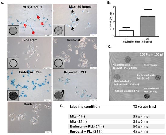 Iron uptake and confirmation of labeling: (A) Prussian Blue staining of INS-1E cells labeled with magnetoliposomes (MLs) at 50 μg Fe/mL medium for 4 h indicates that MLs adhered on the cell membrane (red arrows), whereas longer incubation (24 h) resulted in particle uptake and prominent blue staining in the cell cytoplasm (black arrows). Prussian Blue staining of INS-1E cells labeled with Endorem and Resovist alone at 50 μg Fe/mL medium for 24 h indicated no or only marginal uptake, whereas 100% of cells were labeled when superparamagnetic iron oxide particle (SPIOs) were conjugated with poly-l-lysin (PLL). Inserts in all Prussian blue-stained microscopic images show the T2*-weighted MR images for the different labeling conditions after 24 h of labeling. Hypointensity (dark contrast) represents the labeled cells. (B) Inductively-coupled plasma optical emission spectrometry (ICP-OES) measurements of INS-1E cells labeled with MLs showed a marked increase in iron uptake with increasing incubation time (1.64 ± 0.70 pg/cell at 4 h and 5.33 ± 1.9 pg/cell at 24 h) (Mean ± S.D.). Scale bar: 50 μm. (C) T2-weighted MR image of agar phantom-containing labeled pancreatic islets (100 islets suspended in 100 μL after labeling with Resovist + PLL, Endorem + PLL, and MLs. (D) T2-values acquired from the phantoms shown in (C).