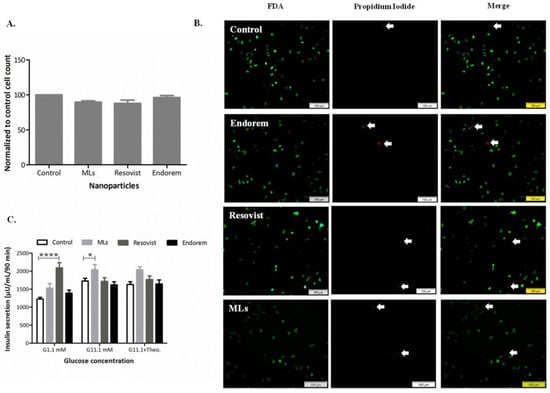 To assess the proliferation and viability of INS-1E cells labeled with MLs, versus commercially available SPIOs in vitro, total cell counts and FDA/Propidium iodide staining were performed, respectively. Figure 2A indicates that when INS-1E cells were labeled with three different SPIOs under the same labeling condition (50 μg Fe/mL medium for 24 h), no negative effect on cell proliferation could be observed. Total cell counts of all INS-1E cell samples were always compared with non-labeled control samples. Viability staining post-labeling, as shown in Figure 2B, indicated only a non-significant, marginal amount of dead cells (in red), compared to the viable (in green) cells observed for all labeling conditions. We further investigated whether the labeling (at 50 μg Fe/mL medium) affects the insulin secretion of INS-1E cells after stimulation with glucose at different concentrations (1.1 mM, 11.1 mM in presence and absence of theophylline). Figure 2C shows that INS-1E cells labeled with Resovist showed a significant increase in insulin secretion at hypoglycemic glucose concentration (1.1 mM). MLs-labeled INS-1E cells also showed a slight elevation in the insulin secretion at hyperglycemic (11.1 mM) glucose stimulation. Insulin secretion levels remained comparable to the values from unlabeled control cells when labeled with Endorem and stimulation in presence of theophylline.