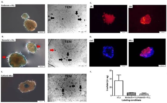 Iron uptake by rat islets: Iron uptake by pancreatic islets (PIs) was confirmed by Prussian blue staining and transmission electron microscopy (TEM), when labeled with (A) Endorem + PLL, (B) Resovist + PLL, and (C) cationic MLs. PIs labeled with Endorem + PLL and Resovist + PLL showed heterogeneous uptake in different islets of the same batch. MLs showed uptake already after 2 h, and elevated uptake was observed after 18 h of co-incubation with MLs. (D) Confocal microscopy was performed to confirm the uptake of the MLs by PIs. (E) Prussian blue staining and TEM were performed to confirm the uptake. The presence of particles adhered to the cell membrane is indicated by red arrows for the Prussian blue and TEM images. (F) Iron content in the labeled PIs (n = 2) was measured with inductively-coupled plasma optical emission spectrometry (ICP-OES). Scale bar: 2 μm for TEM; data expressed as mean ± SD.