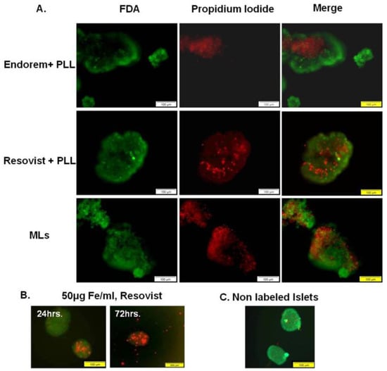 Islet viability: None of the SPIOs showed negative effects on the viability of islet cells (FDA/propidium iodide staining) after labeling. (B) In order to generate magnetic resonance (MR)-detectable uptake by using Resovist, without addition of PLL, 72 h of incubation was necessary. But severe effects on the islet viability were observed after such prolonged incubation times. (C) Non-labeled islets immediately after isolation. Scale bar: (A,B) 100 μm, (C) 200 μm.