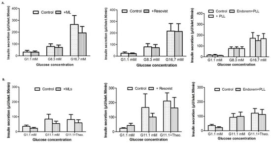 Effect of labeling PIs on their insulin secretion: (A) Insulin release from PIs in the presence of glucose (1.1, 8.3 and 16.7 mM) when labeled with MLs (left panel), Endorem + PLL (middle panel), and Resovist + PLL (right panel) at 50 μg/mL for 24 h. (B) Insulin release from islets labeled with magnetoliposomes, Endorem + PLL, and Resovist + PLL at 50 μg Fe/mL, in the presence of low (1.1 mM) and high (11.1 mM) glucose concentrations with and without 1.4 mM theophylline). These results indicate no negative effects on glucose-stimulated insulin secretion (GSIS).
