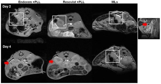 We assessed the feasibility of monitoring islets transplanted in the sub-capsular space of kidneys in healthy mice longitudinally, by using in vivo MR imaging. We implanted 200 PIs, labeled with Endorem (+PLL), Resovist (+PLL), or MLs under the left kidney capsule. Figure 6 indicates MRI performed at the different time points, indicating a marked decrease in the signal intensity (white square in Figure 6) on T2-weighted MR images. PIs labeled with MLs showed a hypointense signal until day four, whereas PIs labeled with Endorem or Resovist (+PLL) did not show any hypointense signals by day four. The higher MRI sensitivity of MLs can be explained by intracellular aggregation caused after partial degradation of the outer lipid layer in the lysosomal environment [31,32].