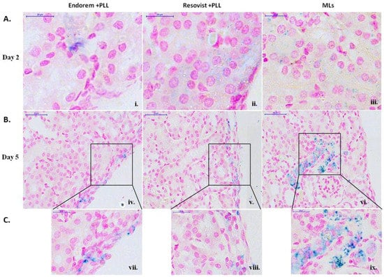 Prussian blue staining: (A) (i–iii) Prussian blue staining of kidney tissue clearly indicated the presence of blue stain along the sub-capsular region by day two for all labeling conditions. Figures (B) (iv–ix) show staining for later time points after transplantation. Prominent staining was observed for the PIs labeled with MLs for up to five days, which was not the case for the other labeling conditions. Figure (C) (vii–ix) shows higher magnification images for day five. Scale bar: (i–iii) and (vi–ix): 20 μm, (iv–vi): 50 μm.