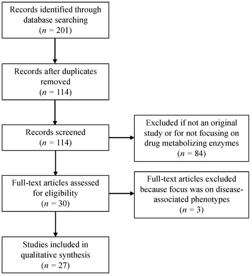 The primary focus of this review is to provide a summary of the P450 pharmacogenetic research conducted with and for Indigenous North American populations. We conducted a systematic literature review to identify published studies of P450 genetic variation, allele frequency and drug metabolism in AIAN, Indigenous peoples of Canada and Amerindians. A search of PubMed was performed using the keywords “Alaska Native,” “American Indian,” “Native American,” Canadian Native Indian,” “First Nations,” “Canadian Inuit,” “Mexico Amerindian,” “Mexico Indigenous,” “cytochrome P450 polymorphisms,” “Pharmacogenetics,” and “CYP450 allele frequencies,” “drug disposition,” and “drug metabolism.” Inclusion criteria were original research studies published in English and cited in PubMed between 1990 and October 2017. Figure 1 depicts the number of records identified and included or excluded by the aforementioned criteria.