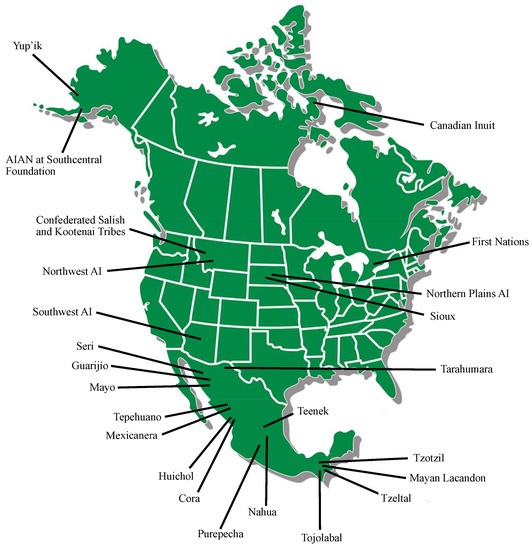 According to the 2011 National Household Survey in Canada, 1.4 million people reported Canadian Aboriginal identity, representing a population increase of 20% since 2006 [4]. Of this population, 60.8% identified as First Nations (FN) people, 32.3% as Métis and 4.2% as Inuit. We will refer to the individuals described in previous studies as Canadian Aboriginal, Canadian Native Indian and Canadian Indigenous as FN, Métis, or Inuit peoples, or more broadly as “Indigenous peoples of Canada,” in this review. The 2010 United States Census reported that 5.2 million American Indian and Alaska Native (AIAN) people live in the United States, with the AIAN population having grown 39% in the preceding decade [5]. The population of Mexico is stratified into two main groups: Amerindians, Indigenous people with over 68 ethnic groups representing 7% of the Mexican population and Mestizos, a group that arose as the result of admixture among Europeans, Amerindians and African slaves [6,7,8]. For the purposes of this paper, Amerindian will refer to Amerindian Indigenous populations from Mexico.