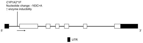CYP1A2 is a highly polymorphic enzyme responsible for the metabolism of many drugs including clozapine [54], mirtazapine [55], theophylline [56], tizanidine [57] and triamterene [58]. CYP1A2*1F is associated with increased enzyme activity in the presence of an inducer, such as high caffeine consumption or heavy cigarette use (Figure 4) [59,60,61].