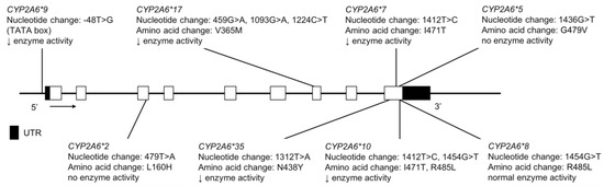 - Haberl, M.; Anwald, B.; Klein, K.; Weil, R.; Fuss, C.; Gepdiremen, A.; Zanger, U.M.; Meyer, U.A.; Wojnowski, L. Three haplotypes associated with CYP2A6 phenotypes in Caucasians. Pharmacogenet. Genom. 2005, 15, 609–624. [Google Scholar] [CrossRef]