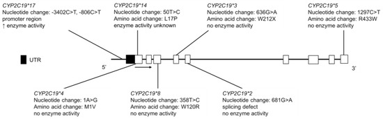 - Sim, S.C.; Risinger, C.; Dahl, M.L.; Aklillu, E.; Christensen, M.; Bertilsson, L.; Ingelman-Sundberg, M. A common novel CYP2C19 gene variant causes ultrarapid drug metabolism relevant for the drug response to proton pump inhibitors and antidepressants. Clin. Pharmacol. Ther. 2006, 79, 103–113. [Google Scholar] [CrossRef] [PubMed]