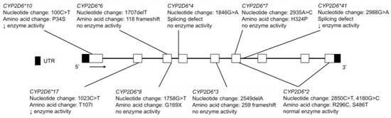 - Broly, F.; Gaedigk, A.; Heim, M.; Eichelbaum, M.; Morike, K.; Meyer, U.A. Debrisoquine/sparteine hydroxylation genotype and phenotype: Analysis of common mutations and alleles of CYP2D6 in a European population. DNA Cell Biol. 1991, 10, 545–558. [Google Scholar] [CrossRef] [PubMed]
