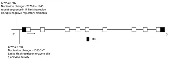 The CYP2E1 enzyme metabolizes ethanol [141,142,143], tobacco-related nitrosamines [144], as well as other xenobiotics (e.g., acetaminophen) [145,146]. CYP2E1 is also induced by ethanol, increasing alcohol metabolism in cases of chronic ethanol consumption [146,147,148]. CYP2E1*1D has been associated with greater CYP2E1 induction by ethanol in individuals with at least one copy of the allele (Figure 10) [149]. The CYP2E1*5B allele, also referred to as CYP2E1*c2, has been associated with increased enzyme activity (Figure 10) [150,151].