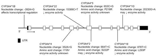 - Wang, D.; Sadee, W. CYP3A4 intronic SNP rs35599367 (CYP3A4*22) alters RNA splicing. Pharmacogenet. Genom. 2016, 26, 40–43. [Google Scholar] [CrossRef] [PubMed]