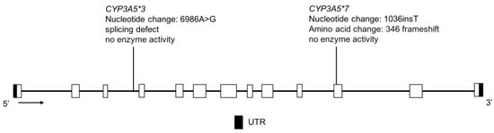 The CYP3A4 and CYP3A5 enzymes have overlapping substrate specificity and together, they control the clearance of approximately 50% of all drugs eliminated primarily through P450-mediated biotransformation [15]. CYP3A4 protein is present in almost all adults, whereas CYP3A5 protein expression varies across different ethnic groups [153]; polymorphisms in the genes encoding these proteins are shown in Figure 11 and Figure 12. The CYP3A5 enzyme is expressed in individuals having at least one CYP3A5*1 allele, while those with two inactive alleles, CYP3A5*3, *6, or *7, encode a nonfunctional protein (Figure 12); the PM phenotype is most common in Europeans and less so in Asians and African Americans [154,155]. The CYP3A4*22 variant is also associated with reduced CYP3A4 protein levels and enzyme function (Figure 11) [156,157,158], as are rare deleterious coding variants [159]. The CYP3A4*1B and CYP3A4*1G alleles (Figure 11) reportedly affect gene transcription but functional effects are unclear, as the data are mixed and interpretation is complicated by high linkage disequilibrium with CYP3A5*1 [160,161,162].