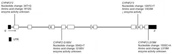 - Danese, E.; Montagnana, M.; Johnson, J.A.; Rettie, A.E.; Zambon, C.F.; Lubitz, S.A.; Suarez-Kurtz, G.; Cavallari, L.H.; Zhao, L.; Huang, M.; et al. Impact of the CYP4F2 p.V433M polymorphism on Coumarin dose requirement: Systematic review and meta-analysis. Clin. Pharmacol. Ther. 2012, 92, 746–756. [Google Scholar] [CrossRef] [PubMed]