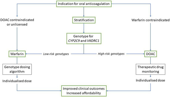 Clinical pathways for stratification in the use of oral anticoagulants. Use of either warfarin or a direct oral anticoagulant (DOAC) would require individualisation of the dose to improve time in therapeutic range and optimisation of anticoagulation, resulting in improved clinical outcomes. This would also result in improved affordability.