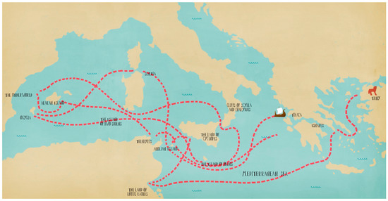 The journey of Odysseus. 0: Troy; 1: Ismarus; 2: The land of the Lotus-eaters; 3: The land of the Cyclopes; 4: The Aeolian island; 5: Telepylus, the city of the Laestrygonias; 6: Aeagean island (Circe’s island); 7: The Underworld (The house of Hades); 8: The island of the two Sirens; 9: Cliffs of Scylla and Charybdis; 10: The island of Helios; 11: Ogygia (Calypso’s island); 12: Scheria (island of the Phaeaians); 13: Ithaca.