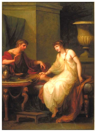 Ethical issues also troubled Odysseus when he met the goddess Circe, a beautiful witch, who was keen on using magic herbs on travellers that passed nearby, transforming them into wild beasts. He was advised by the god Mercury on how to resist her magic potions with a protective talisman and how to provide himself with her loyalty by going to bed with her. Odysseus was deeply in love with his faithful wife Penelope, but did not bother about keeping company with Circe for an entire year (Figure 5). Afterwards, the soldiers became anxious to return and the journey had to continue. Circe kept her promise to help and furthered them towards the House of Hades.