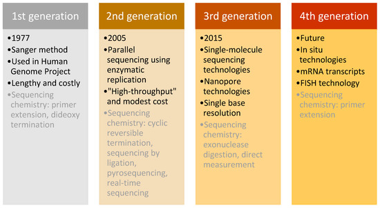 - Heather, J.M.; Chain, B. The sequence of sequencers: The history of sequencing DNA. Genomics 2016, 107, 1–8. [Google Scholar] [CrossRef] [PubMed]