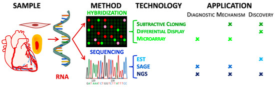 Subtractive cloning is an inexpensive and common technique in individual biomedical and clinical laboratories to analyze gene expression using readily available molecular biology resources. It is a hybridization technique used to detect genes specific to a cell or tissue using a subtraction protocol to remove all common sequences between control and experimental cDNA libraries (i.e., cell type, drug treatment, disease condition etc.) yielding a specific library representing differentially expressed genes. Hybridization of cDNA may cause bias for small fragments of cDNA that hybridize faster than long sequences, but is resolved by PCR amplification [15]. These enriched libraries can be used in conjunction with other transcriptomics techniques, such as microarray or NGS (2.1). Likewise, the other common routine hybridization technique, Differential Display, is a PCR-based method that also detects and measures differential gene expression without using specific primers, making it a robust, inexpensive discovery tool [16]. Current innovations incorporate the use of fluorescent labels with automation to yield high throughput analyses [17,18]. These techniques have been applied successfully to understand molecular and cellular pathways involved in stem cell differentiation by identifying the expressed genes causing lineage commitment into megakaryocytes, erythrocytes, and granulocytes, which play different roles in atherosclerosis disease developmental and disease progression [19].
