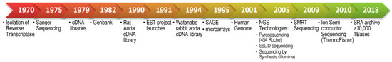 Sanger sequencing is the keystone invention for modern methods, such as NGS, to sequence for expressed genes in transcriptomic studies. Sanger sequencing is the “first-generation” method of determining DNA nucleotide sequence based on the chain-termination idea developed in 1975 [24] (Figure 2). Modern modification of this classic method is based on in vitro DNA elongation of target template, which is interrupted by labelled di-deoxynucleotides (ddNTPs) to halt DNA strand synthesis for sorting and fluorescence detection (Figure 3B) [20]. Expressed genes are identified using various methods to harvest RNA to make and use cDNA for expression studies, including subtractive cloning, EST, SAGE, differential display analysis, and microarray analysis (Figure 1 and Figure 3). Once identified, gene interactions with other genes can be pursued experimentally [20]. In the late 1970s, cDNA libraries [25] became popular for gene discovery and expression analysis, as the library clones were stable, reproducible, and recoverable representations of mRNAs isolated from distinct organs and species, although they were not embraced in the field of atherosclerosis for over 10 years until the early 1990s with sequencing of rat and rabbit aorta cDNA libraries (Figure 2) [26,27]. Meaningful data are generated with high throughput preparation of either normalized or non-normalized cDNA libraries [28].