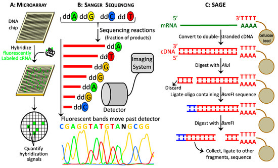 Older technologies used in gene expression studies. (A) In microarray experiments, labeled cRNA are used to measure the gene expression level by hybridization to cDNAs on glass slides representing known genes. The intensities are measured, normalized, and analyzed by computer software to compare experimental treatments or conditions. (B) Sanger sequencing was the original method of measuring DNA nucleotide sequence based on chain-dye termination and the first technology for sequencing of expressed genes. (C) Steps in producing concatenated short tags for subsequent sequencing in SAGE method.