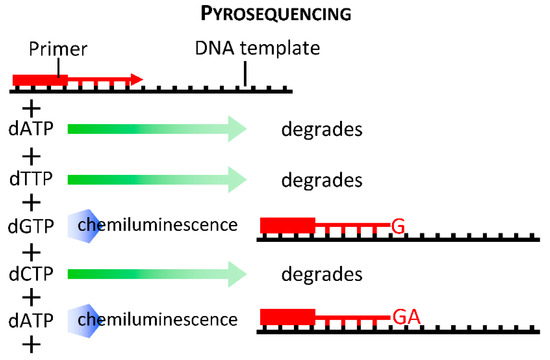 The latest generation of sequencers is distinguished from first and second generations by eliminating sample amplification. Bypassing sample amplification reduces sample preparation time and eliminates signal mismatch and distortion errors introduced during amplification. In addition, these single-molecule sequencers produce extremely long reads, surpassing the lengths achieved by Sanger sequencing. The Pacific Biosciences Single Molecule Real Time (SMRT) sequencer utilizes pyrosequencing (Figure 4) in polymerase-embedded plates, which lower the signal-to-noise ratio to detect real-time signal processing of fluorophore cleavage. The use of pyrophosphate-labeled nucleotides in polymerase-containing plates to extend DNA at near its natural speed facilitates processivity and output length of sequencing read. Another third generation sequencing platform available now is nanopore sequencing (MinION, Oxford Nanopore Technologies, Oxford Science Park, Oxford, UK). This technology utilizes electrophoresis of DNA molecules via nanopores (5–8 nm diameter); as the DNA molecules squeeze through the pore, each nucleotide (A, T, G and C) produces a unique electromagnetic signature is detected. Similar to SMRT, nanopore sequencing can produce very long reads, up to 880 kb in a recent report [53].