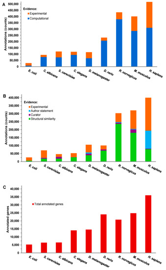 Description of gene functions in scientific literature can vary significantly among authors, even if all of them are describing the same phenomenon. Consequently, unbiased grouping of genes by functional similarities may become a daunting endeavor. To facilitate the task of classifying the universe of genes, the methods of formal ontology were applied to create the first controlled vocabulary to standardize gene descriptions across species and disciplines. The resulting Gene Ontology (GO), and GO Consortium were formed in 1998 to create a framework for standardizing gene products description [77]. Since its inception, GO was used to annotate millions of genes, with over 1,350,000 annotations for H. sapiens, R. norvegicus, and M. musculus genes alone [78] (Figure 6A). The highest-level annotations for genes in GO is a “trinity” of Molecular Function, Cellular Component, and Biological Process hierarchies. Currently, GO uses 29,623 “Biological Process”, 11,139 “Molecular Function”, and 4,189 “Cellular Component” terms, and strict rules to describe evidence linking a gene to a term (from relatively vague “Inferred from Sequence or structural Similarity” to strong “Inferred from Experiment”), to annotate genes across the tree of life (Figure 6B); taking into account the total number of annotated genes in species (Figure 6C), currently average number of GO annotations ranges from 5 for E. coli to 21 for R. norvegicus.