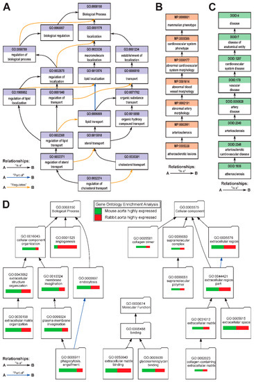 GO is organized as a graph, with individual terms being nodes, and relationships between terms being edges. For example, one of the GO annotations of an “atherosclerosis gene” Apoe is “regulation of cholesterol transport (GO:0032374)”; the relationship of this term to higher-level terms is shown in Figure 7A. Currently, there are eight types of relationships between terms, and the “is_a” relationship gives this ontology a loose hierarchy, with more general terms being “parent” to more specific “child” terms [77]; other common relationships are “part_of” and “regulates” (Figure 7A). Curation remains an ongoing process, including the field of cardiovascular disease and atherosclerosis [79], and new annotations, and new GO terms are added frequently as scientific and specific knowledge expands. The dynamic nature of GO catalyzes new discoveries to be readily integrated into the existing ontology, while older annotations are updated with new information as it becomes available. Following the success of GO, other ontologies began to emerge to formalize biological and biomedical knowledge to assist in large-scale data analysis and discovery of new treatment avenues. Relevant examples (Table 1) include Mammalian Phenotype Ontology [80] and Human Disease Ontology [81,82], both used to formalize descriptions of normal and disease phenotypes, in our example specific for atherosclerosis (Figure 7B,C). Another example Ontology, Protein Ontology, describes evolutionary relation, isoforms, and complexes of proteins [83,84]. All these, and many other ontologies collectively form an Open Biological and Biomedical Ontology (OBO) Foundry and share common goals to facilitate curation, management, distribution, and analysis of data [85].