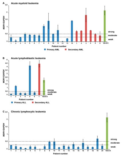 The MDR1 mRNA expression levels in tumor cells of leukemia patients. The following scale was used for the distribution of patients with acute myeloid leukemia (A), acute lymphoblastic leukemia (B), and chronic lymphocytic leukemia (C) in accordance with MDR1 mRNA expression levels in tumor cells: weak expression corresponds to 0–15% of the level of KB-8-5 cells, moderate expression corresponds to 15–25% of the level of KB-8-5 cells, and strong expression corresponds to >25% of the level of KB-8-5 cells.