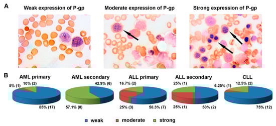 P-glycoprotein expression in tumor cells of leukemia patients. Typical images of immunocytochemical staining of bone marrow smears with anti-P-glycoprotein monoclonal antibodies (A) and patient distribution according to P-glycoprotein expression levels (B) is presented for patients with acute and chronic leukemia. Representative images of bone marrow smears are presented for patients with primary (left panel) and secondary (central and right panel) acute myeloid leukemia. Black arrows indicate P-glycoprotein positive tumor cells. The number of patients in each group is indicated in parentheses.