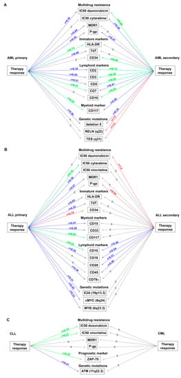 For acute leukemia, many important correlations between the therapy response, drug sensitivity of tumor cells, and key immunological and cytogenetic markers were found (Figure 3A,B), opposite to chronic leukemia, for which significantly fewer correlations were identified (Figure 3C). We also found that the drug resistance of leukemic cells detected in vitro correlates more significantly with the therapy response and immunological and genetic markers than MDR1 mRNA and P-gp levels. It is well known that there are numerous mechanisms of MDR formation, which can be activated simultaneously in tumor cells [7,8]. The WST-test evaluates the total drug responsiveness (sensitivity or resistance) of tumor cells regardless of the mechanism, whereas data on MDR1 mRNA and P-gp expression indicate only MDR1/P-gp-dependent MDR.