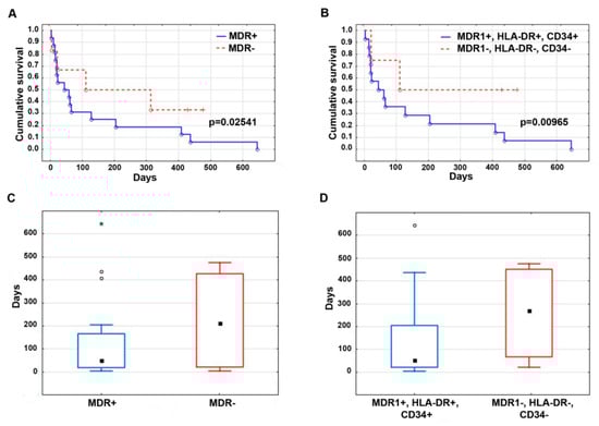 Survival of leukemia patients depending on the presence or absence of unfavorable prognosis factors. The Kaplan–Meier survival curves (A,B) and median follow-up boxes (C,D) were plotted for acute myeloid leukemia (AML) patients with or without MDR1 mRNA expression (MDR1+ and MDR1−, respectively) (A,C) and with or without simultaneous expression of MDR1 mRNA, HLA-DR, and CD34 (MDR1+, HLA-DR+, CD34+ and MDR1−, HLA-DR−, CD34−, respectively) (B,D).