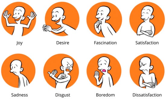 - Huisman, G.; van Hout, M. The development of a graphical emotion measurement instrument using caricatured expressions: The LEMtool. In Proceedings of the Emotion in HCI—Designing for People. Proceedings of the 2008 International Workshop; Frauenhofer Verlag: Stuttgart, Germany, 2010; pp. 5–8. [Google Scholar]