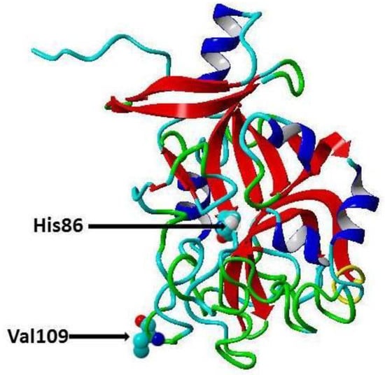 Secondary cartoon structure of human omentin (PDB ID 4WMQ [19]. The amino acid residues, Valine 109 (rs2274907) and the Histidine 86 (rs2274908), are shown in atom presentation. This figure has been prepared using YASARA View (version 17.7.30).