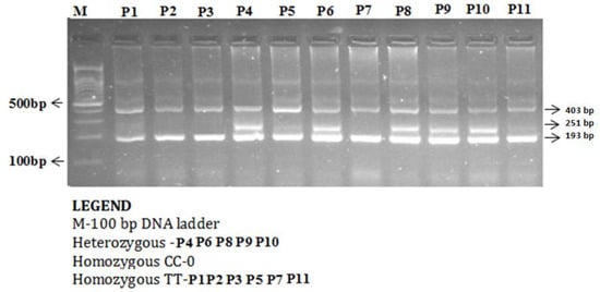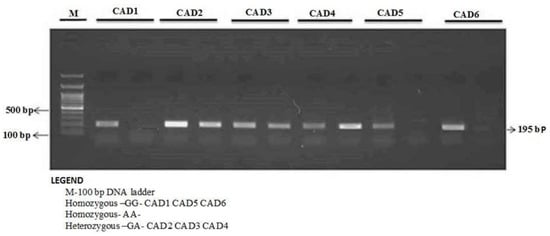 The ARMS-PCR reaction was performed in a 25-μL reaction mixture containing 100 ng template DNA, 0.25 μL of 25 pmol of each primer, 2.5 μL 10 mM dNTP’s 1.5 μL of 20 mM MgCl2, and 0.3 μL of 5 U/μL Taq polymerase with 2.5 μL of 10× Taq Buffer (Fermantas, Waltham, MA, USA). The thermocycling conditions were initial denaturation at 96 °C for 10 min and 30 cycles: 96 °C for 30 s, 60 °C for 45 s, 72 °C for 45 s, and final extension at 72 °C for 5 min. The PCR products were analyzed using 1.5% agarose gel electrophoresis. After electrophoresis, amplified PCR products were visualized using ultraviolet trans-illuminator as depicted in Figure 2 and Figure 3.
