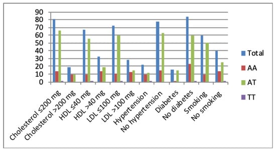 Results indicated that there is no association between RBS and rs2274907 genotype distribution (P-value > 0.05, Table 4). Results also showed that patients with the AT genotype were significantly more susceptible to CAD than the AA or TT genotypes in normal or elevated lipid profiles, diabetes, no diabetes, hypertension, no hypertension, smoking or no smoking (Figure 4, Table 4).