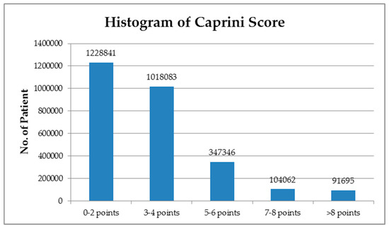Patients among the >8 score group had significantly greater likelihood of developing postoperative VTE in comparison with the group of 3–4 points (odds ratio (OR) = 4.04; 3.61–4.52, p < 0.001), the group of 5–6 points (2.37; 2.10–2.68, p < 0.001), or the group of 7–8 points (1.29; 1.12–1.49, p = 0.004).