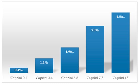 Rates of venous thromboembolism (VTE) after surgery in each group of Caprini scores.