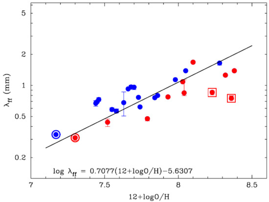 The wavelength at which dust and free-free continuum emission reach the same intensity level is plotted as a function of metallicity for galaxies with L(H) < 10 L (blue filled circles) and L(H) > 10 L (red filled circles). The correlation demonstrates how strongly metallicity affects the dust to free-free emission ratios, while the specific star formation activity of individual galaxies is leading to significant scatter. The encircled galaxies in the lower left are IZw 18 (blue) and SBS 0335–052 (red). The vigorously star forming galaxies Haro 11 and IIZw 40 are indicated by surrounding squares. The solid line is an unweighted fit to the shown Herschel sample with a total of 28 galaxies [67].