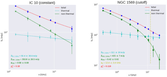 Global radio continuum spectra from IC 10 and NGC 1569, obtained by the Effelsberg 100 m telescope [85]. Measured flux densities: blue squares connected by a red solid line; free-free emission: cyan stars connected by a cyan dotted straight line; non-thermal emission: green crosses connected by a green dashed line. Characteristic parameters are plotted in the lower left, indicating the thermal and non-thermal contributions at 1 GHz. The vertical yellow dash-dotted line in the right panel denotes the break frequency (12.4 GHz), which is also given in the lower left of this panel. The nonthermal spectral indices at 1 GHz and the reduced values of the fits are presented in the lower left corners of both panels.