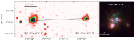 - Pustilnik, S.A.; Brinks, E.; Thuan, T.X.; Lipovetsky, V.A.; Izotov, Y.I. VLA Hi line observations of the extremely metal-poor Blue Compact Dwarf galaxy SBS 0335–052. Astron. J. 2001, 121, 1413–1424. [Google Scholar] [CrossRef][Green Version]