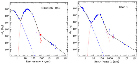 Based on measurements of the H line, a solution to this puzzle has been presented by [67]. After removing the stellar absorption component and accounting for extinction, the H line permits the derivation of massive star formation rates, which also determines the flux densities of the free-free emission. This so-called bremsstrahlung can be significant in galaxies of low metallicity: because of high temperatures and low / ratios, dust emission may start to dominate the continuum emission only at shorter wavelengths and higher frequencies than in larger more metal rich galaxies. Prior to [67] this was already mentioned by [68,69]. However, lacking accompanying H data, they concluded that free-free emission should be insufficient to explain the submillimeter excess. The more metal poor a galaxy is, inhibiting a strong dust continuum at submillimeter wavelengths, and the more active the galaxy is with respect to star formation, enhancing the free-free emission, the more dominant bremsstrahlung becomes, creating a detectable ‘excess’ of continuum emission at wavelengths of ≳500 m (Figure 3; see also [70] and Section 5.2).