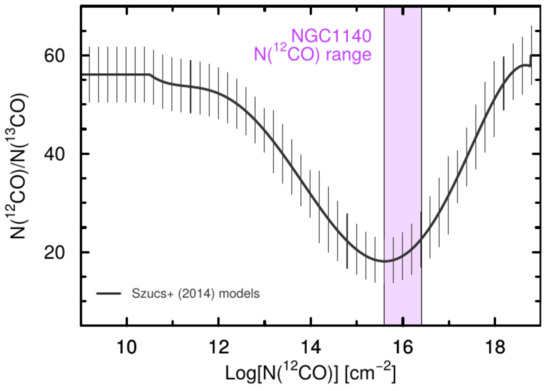 - Szücs, L.; Glover, S.G.O.; Klessen, R.S. The 12CO/13CO ratio in turbulent molecular clouds. Mon. Not. R. Astron. Soc. 2014, 445, 4055–4072. [Google Scholar] [CrossRef]