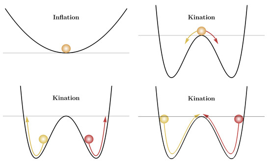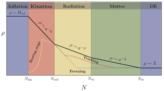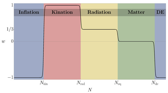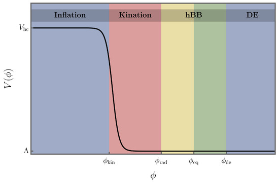 For a homogeneous scalar field, the latest quantity interpolates between a de Sitter value for potential domination, , and a stiff value for kinetic domination, . Thus, as illustrated in Figure 1, the presence in the cosmon potential of two flat or slow-roll regions connected by a steep transition is a priori sufficient to generate two periods of exponential expansion at very different energy scales separated by a stage of kinetic domination. Of course, the wealth of available observational data ranging from CMB observations [4,33] to BBN constraints [34] places several requirements in this model building process [22,35,36,37]. For instance, a phenomenologically successful scenario should be able to generate the correct amplitude and tilt for the primordial power spectrum of density fluctuations, as well as to incorporate a stage of relativistic particle production giving rise to the onset of the hBB era. On top of that, this ambitious program requires the cosmon field to remain quiet and energetically subdominant for an extended period of time after particle creation, such that the standard radiation and matter dominated epochs have the sufficient duration. Eventually, the cosmon field must also exit its quiescence and start behaving as a quintessence component able to support the present accelerated expansion of the Universe, as depicted in Figure 2 and Figure 3. In what follows, we will provide a quick overview of the full cosmological evolution in this type of scenarios, going through the various stages with a minimum amount of details and referring to the extensive literature for more comprehensive analyses.