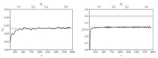 - Tracking freezing models: In this case the cosmon field is initially in slow-roll motion and comes to a halt due the increasing flatness of the potential after a certain critical value. This limit corresponds to a fixed pointwith constant . Since this configuration is stable, the scalar field trajectories will be dragged towards it for a large set of initial conditions, meaning that we are dealing with a tracker solution. If then [122,123], for which approaches 0, the cosmon energy density will grow to dominate the background evolution. Using the relationfollowing from Equation (60) together with Equations (53) and (54) in the limit 1, the effective field equation of state along the tracker is given byNote that, while the presence of the attractor alleviates the initial condition problem in this class of models, a certain degree of tuning is still required in order to recover the correct time at which the cosmon field starts to dominate the energy budget.
